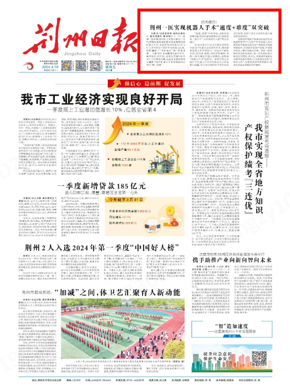 《荊州日報》頭版丨百天破百! 荊州一醫(yī)實現(xiàn)機器人手術“速度+難度”雙突破