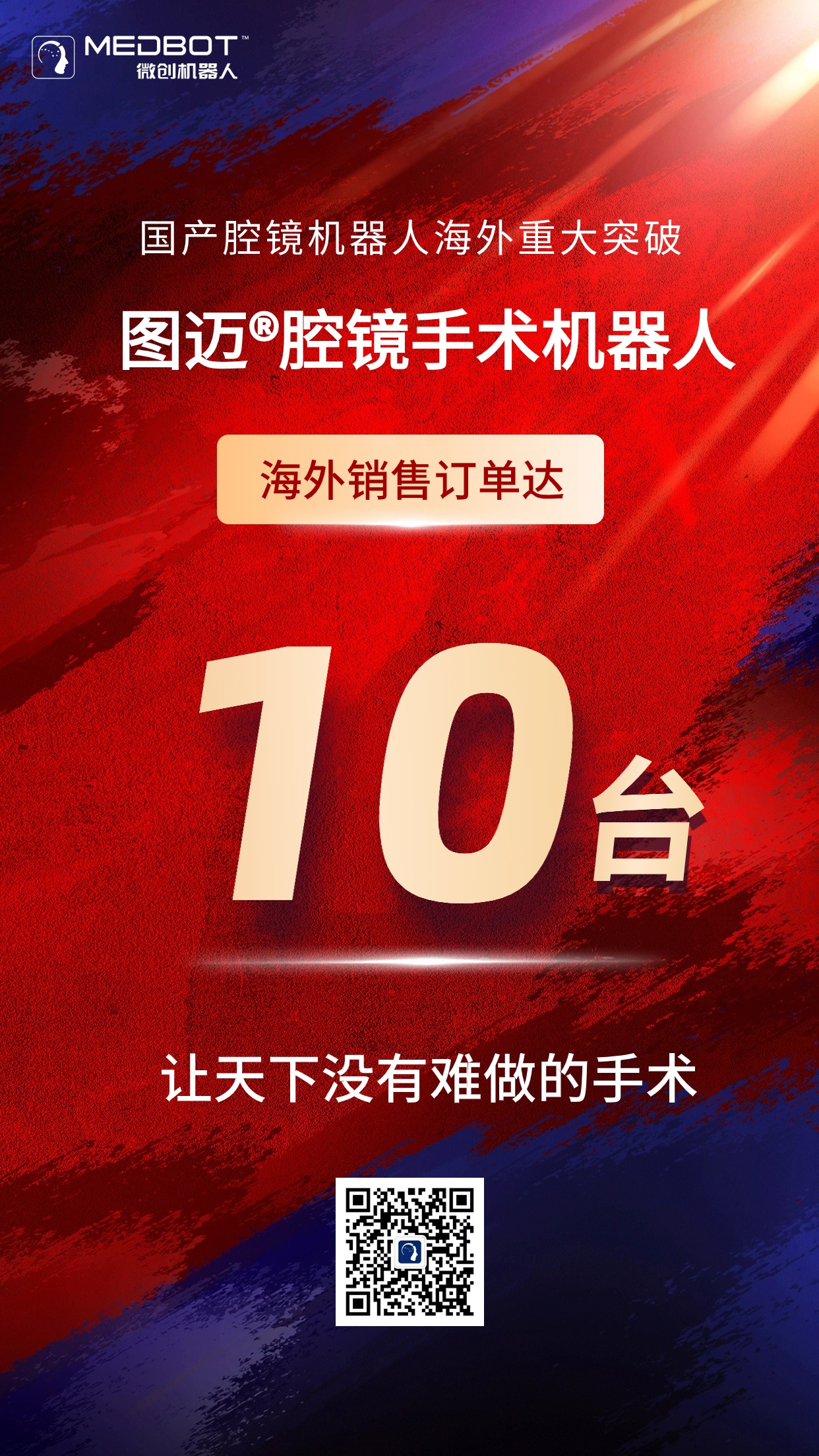 2024年6月22日,微創(chuàng)®機器人集團完成最新海外簽約,圖邁®腔鏡手術機器人累計海外訂單數(shù)量突破10臺,涵蓋多個國家和地區(qū),引領國產(chǎn)腔鏡手術機器人海外商業(yè)化進程。圖邁®機器人初步實現(xiàn)海外規(guī)?;N售,意味著全球手術機器人市場出現(xiàn)分水嶺,品牌呈現(xiàn)新格局。同樣,這也表明國產(chǎn)腔鏡手術機器人在全球高端醫(yī)療裝備市場上再次取得里程碑式重大突破,充分彰顯圖邁®機器人在國際市場上獲得的廣泛認可和強大潛力。