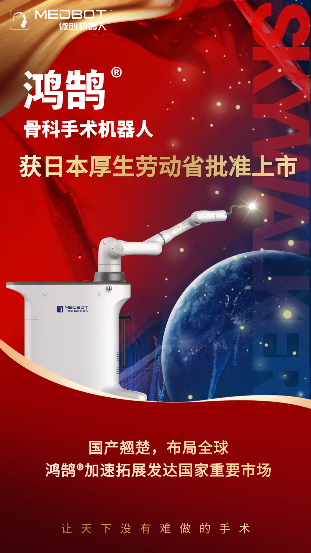 中國,上海——9月26日,上海微創(chuàng)醫(yī)療機器人(集團)股份有限公司(簡稱“微創(chuàng)®機器人”)旗下蘇州微創(chuàng)暢行機器人有限公司研發(fā)的鴻鵠®骨科手術(shù)機器人 (海外產(chǎn)品名SkyWalker™, 以下簡稱鴻鵠®機器人)獲得日本厚生勞動?。∕inistry of Health, Labour and Welfare,簡稱MHLW)批準(zhǔn)上市。