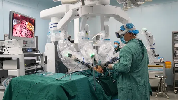 ▲醫(yī)生運(yùn)用空間計(jì)算技術(shù)聯(lián)合機(jī)器人為患者進(jìn)行胸外科手術(shù)。重慶醫(yī)科大學(xué)附屬大學(xué)城醫(yī)院供圖