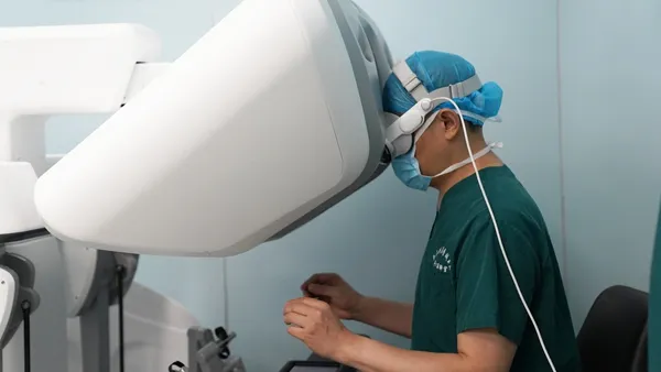 ▲譚群友頭戴空間計(jì)算裝備,操作機(jī)器人進(jìn)行手術(shù)。重慶醫(yī)科大學(xué)附屬大學(xué)城醫(yī)院供圖