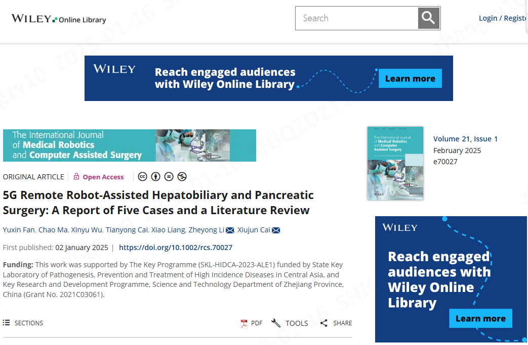 在醫(yī)學(xué)科研領(lǐng)域,SCI(科學(xué)引文索引)論文的發(fā)表是衡量一個(gè)醫(yī)院科室科研水平和學(xué)術(shù)影響力的重要標(biāo)志。1月2日,浙大邵逸夫阿拉爾醫(yī)院醫(yī)院普外二區(qū)團(tuán)隊(duì)成功在國(guó)際知名雜志《The International Journal of Medical Robotics and Computer Assisted Surgery》上發(fā)表了一篇題為《5G remote robot-assisted hepatobiliary and pancreatic surgery: A report of five cases and a literature review》的論文,被SCI數(shù)據(jù)庫(kù)收錄,標(biāo)志著醫(yī)院在科研領(lǐng)域取得了重要突破。